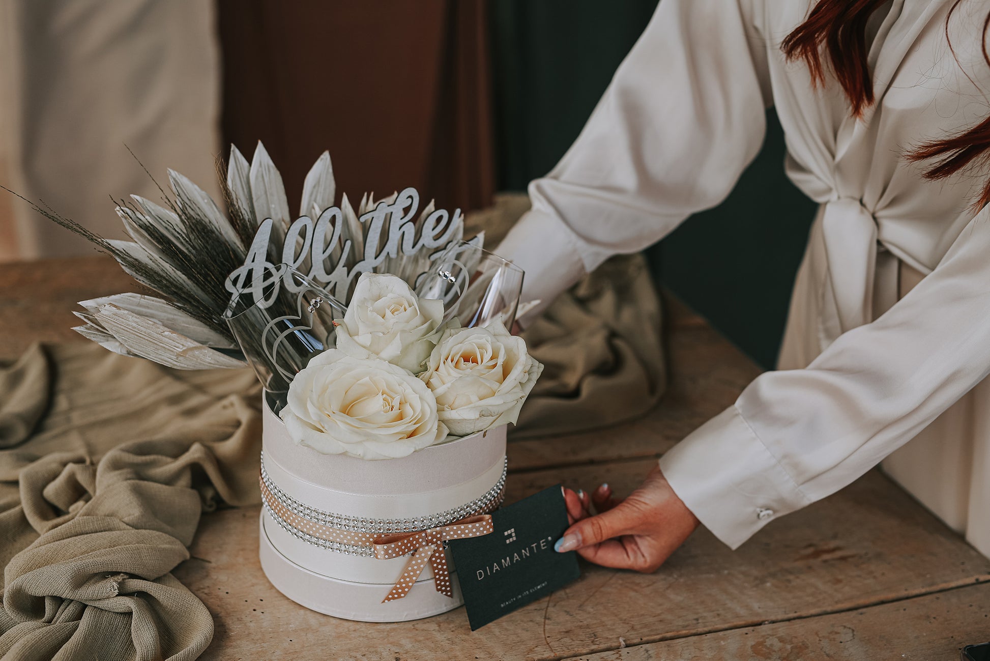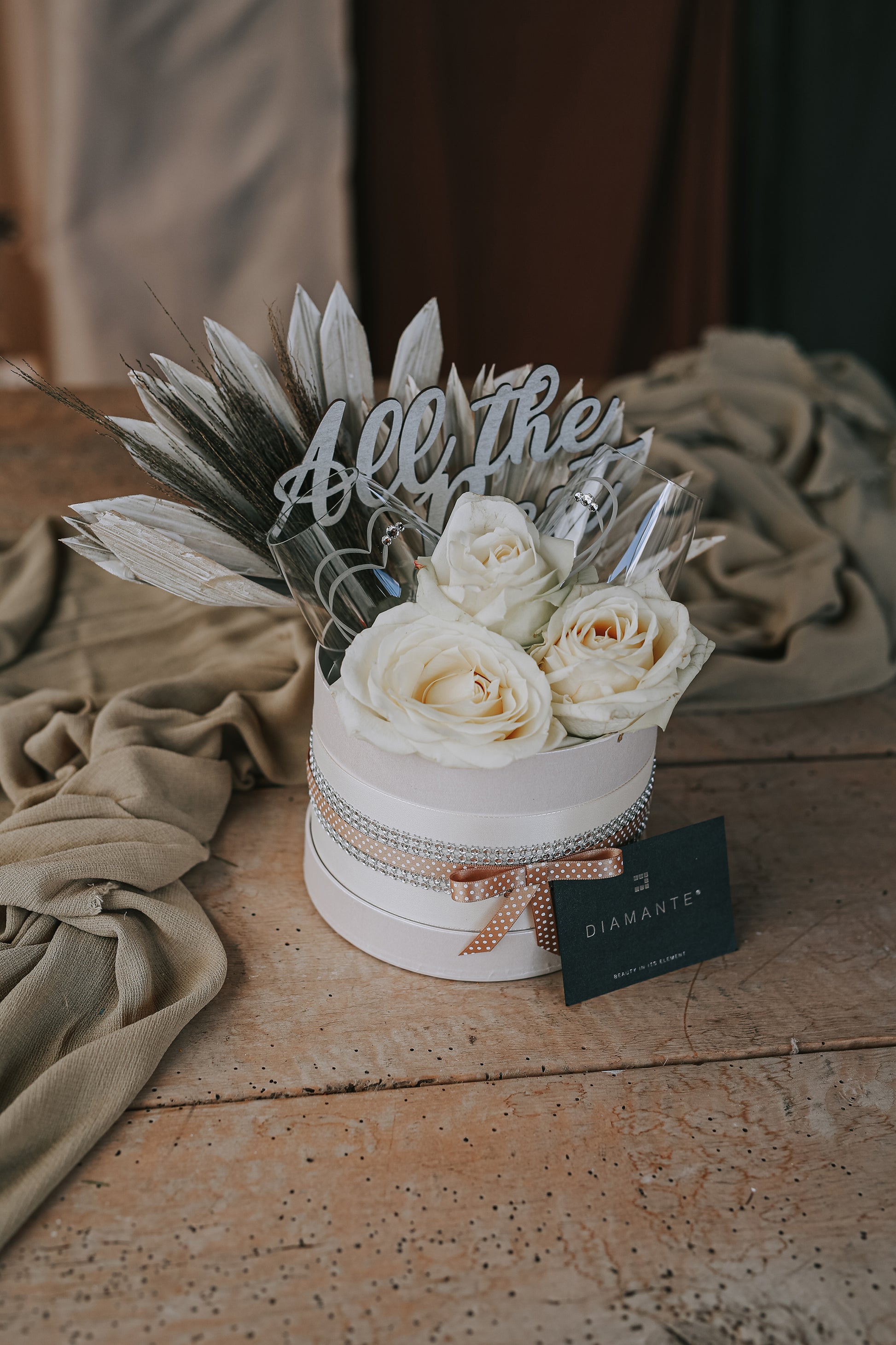 Wir haben zwei Swarovski-Gläser und ein Blumenarrangement in einer dekorativen Box vorbereitet.