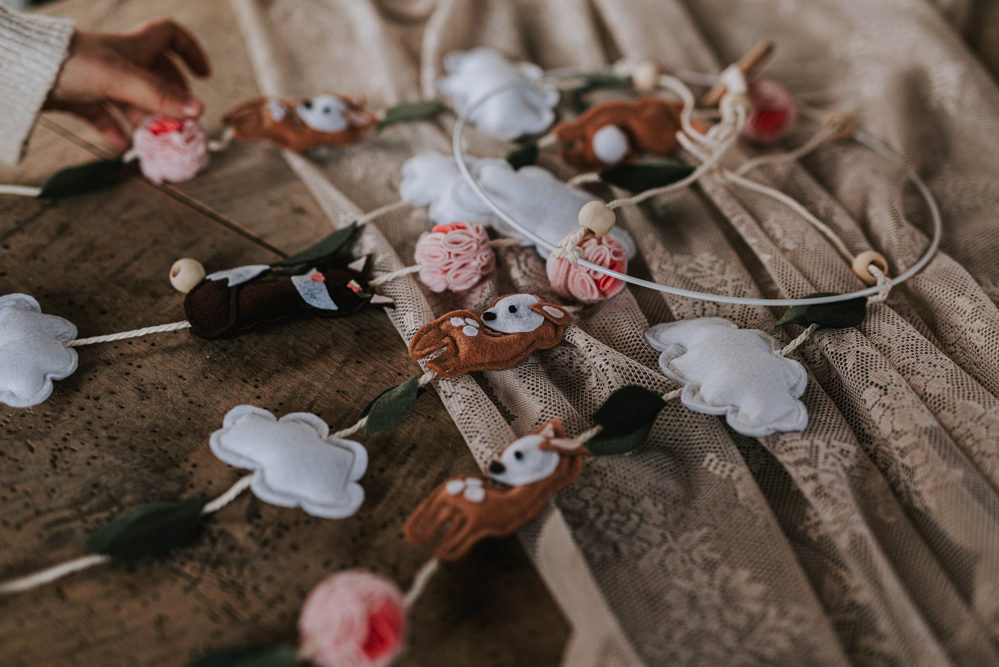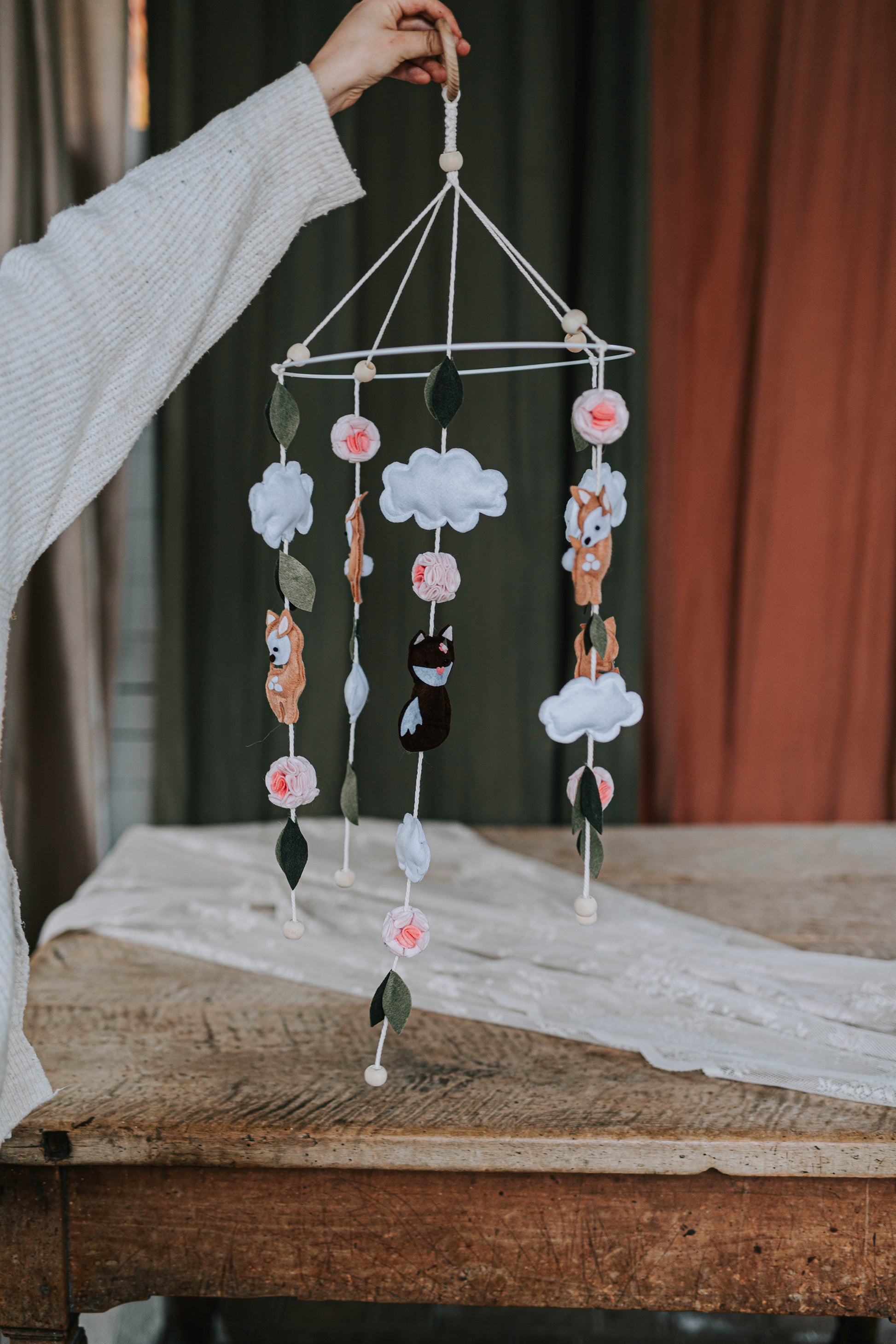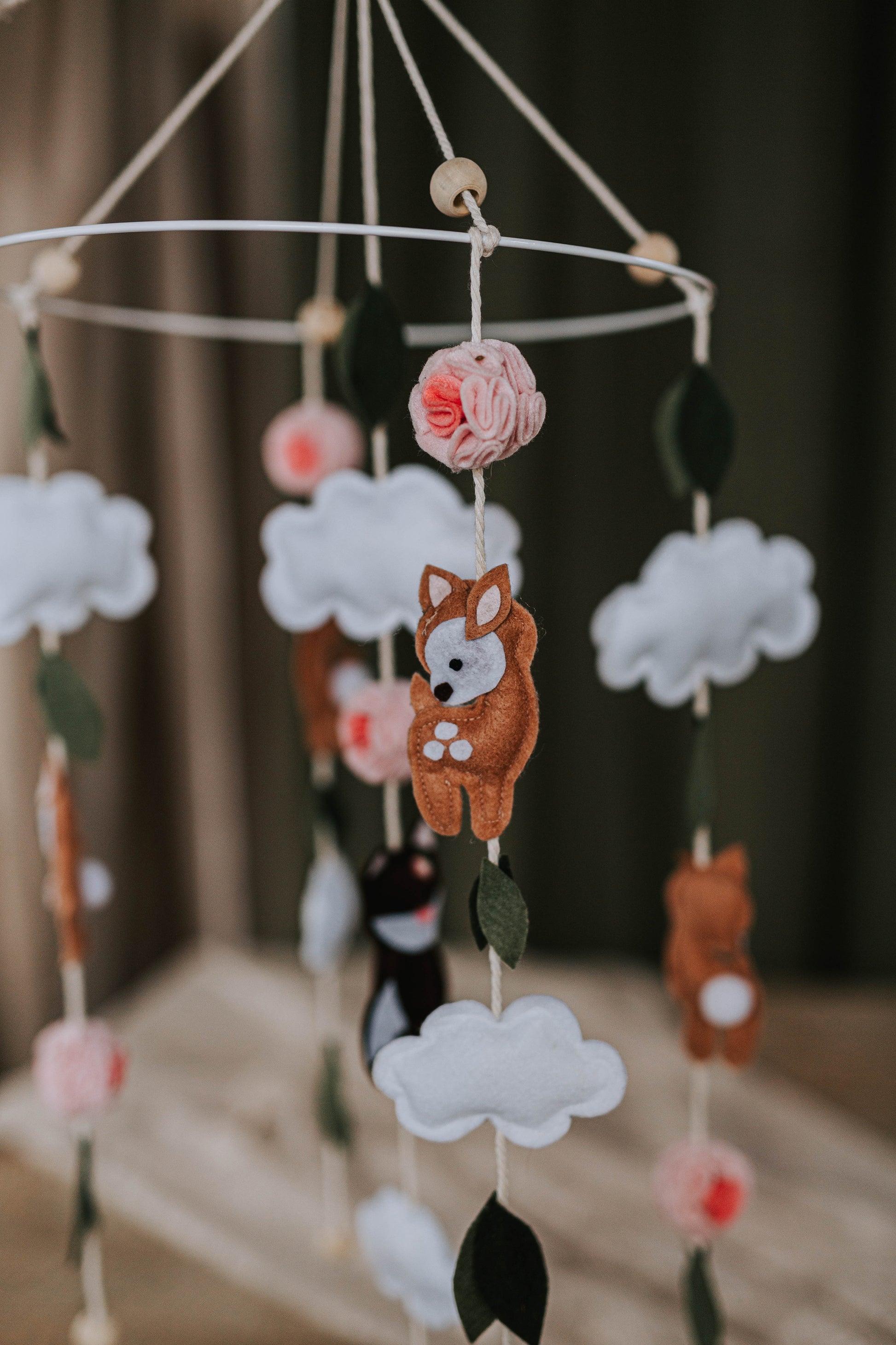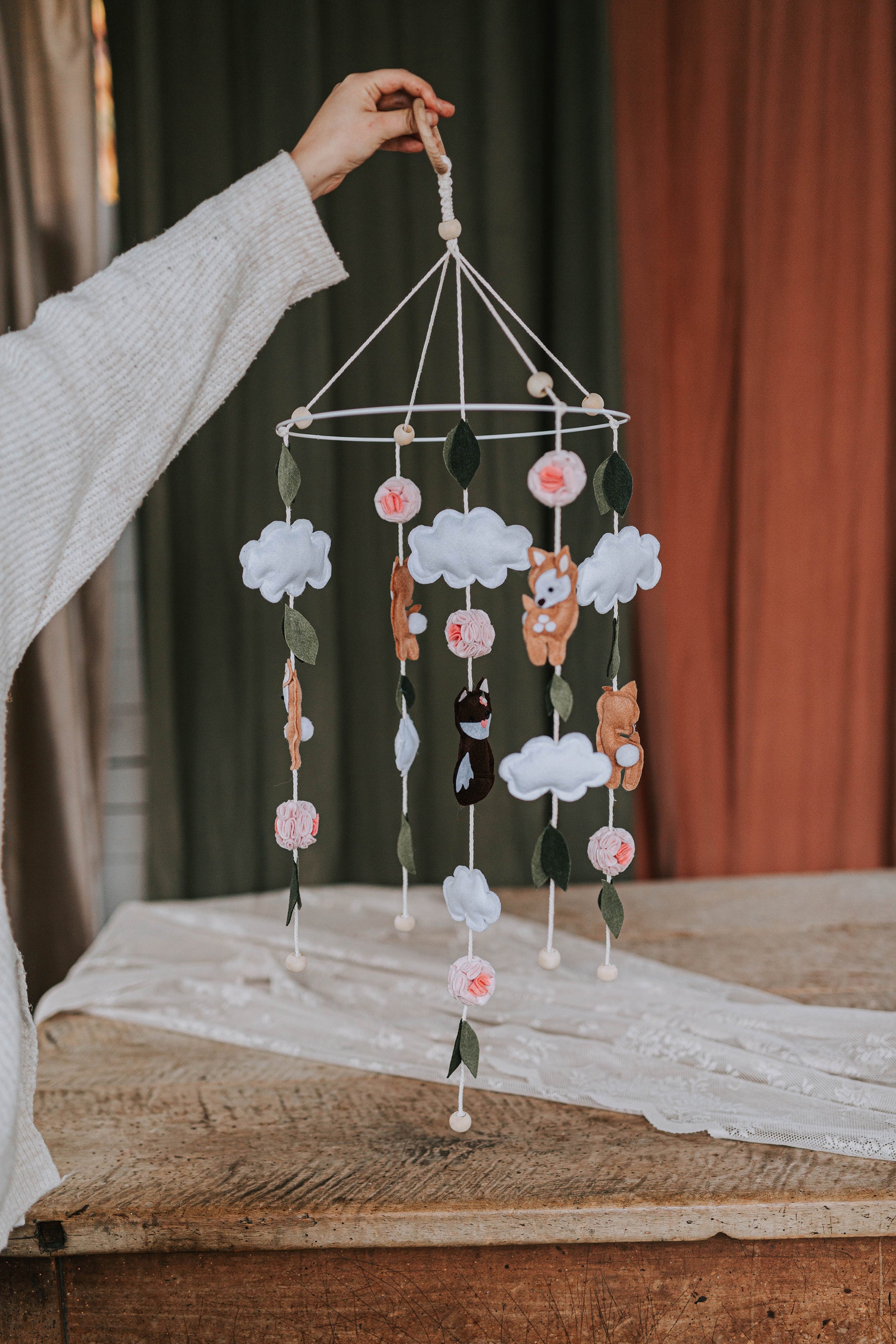 Das aus Filz gefertigte Mobile, also Karussell mit Stofftieren , ist ein außergewöhnliches Spielzeug für die Krippe, das für die Kleinsten ab der Geburt geeignet ist. Babys werden großen Spaß daran haben, die hängenden Plüschtiere zu beobachten, darunter Rehe, Kätzchen, Seifenblasen, Hasen und es gibt auch Holzkugeln.