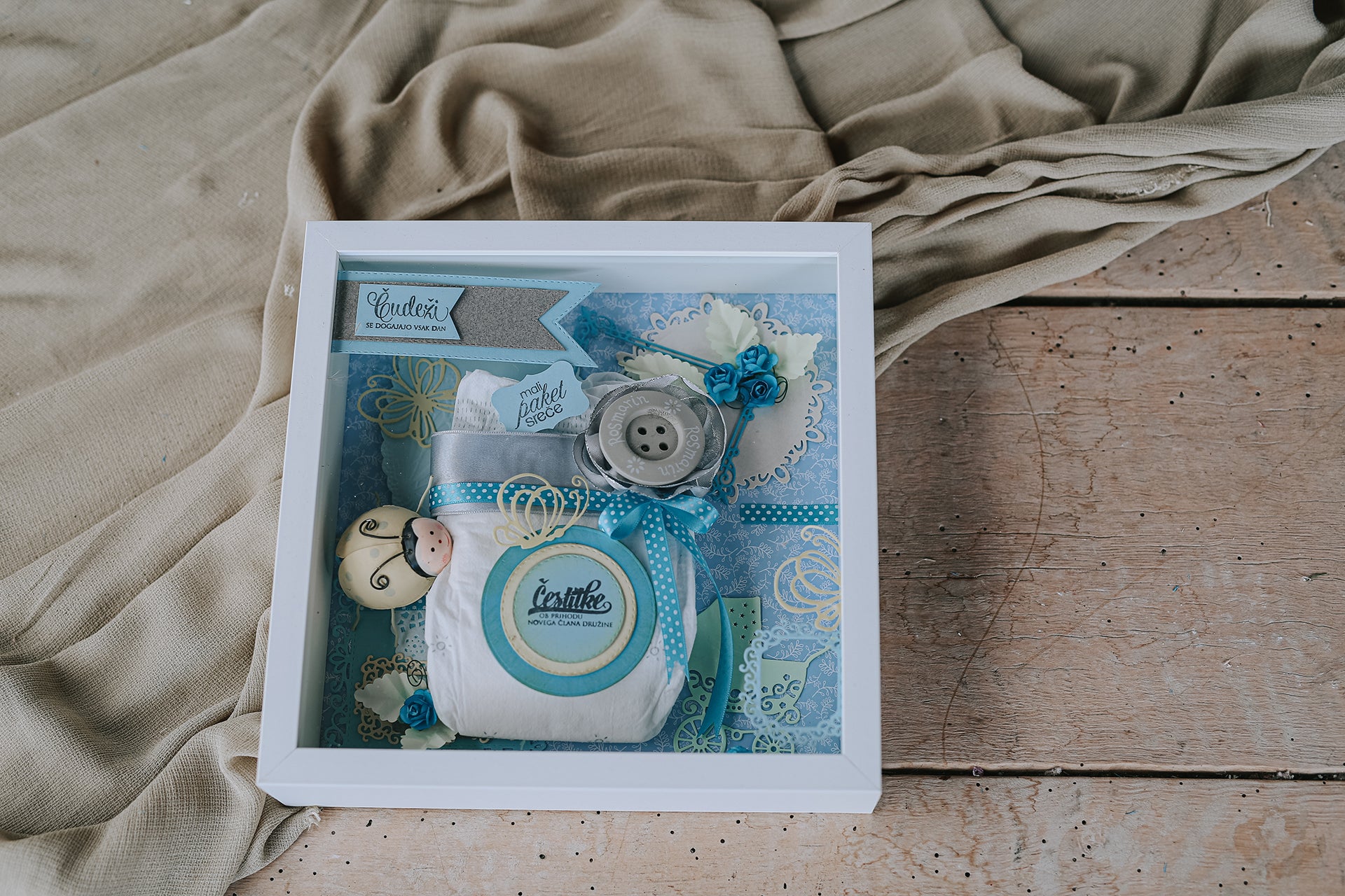 Wenn ein Neugeborenes geboren wird, ist ein Gestell mit Windel ein ideales Geschenk, das sowohl den Eltern als auch später dem Kind in bleibender Erinnerung bleiben wird. Im Rahmen befindet sich eine mit Seidenbändern verzierte Windel, diverse Deko-Accessoires in Blau, mit einem Glücksknopf und einem Marienkäfer und aufgesetzten Sprüchen.