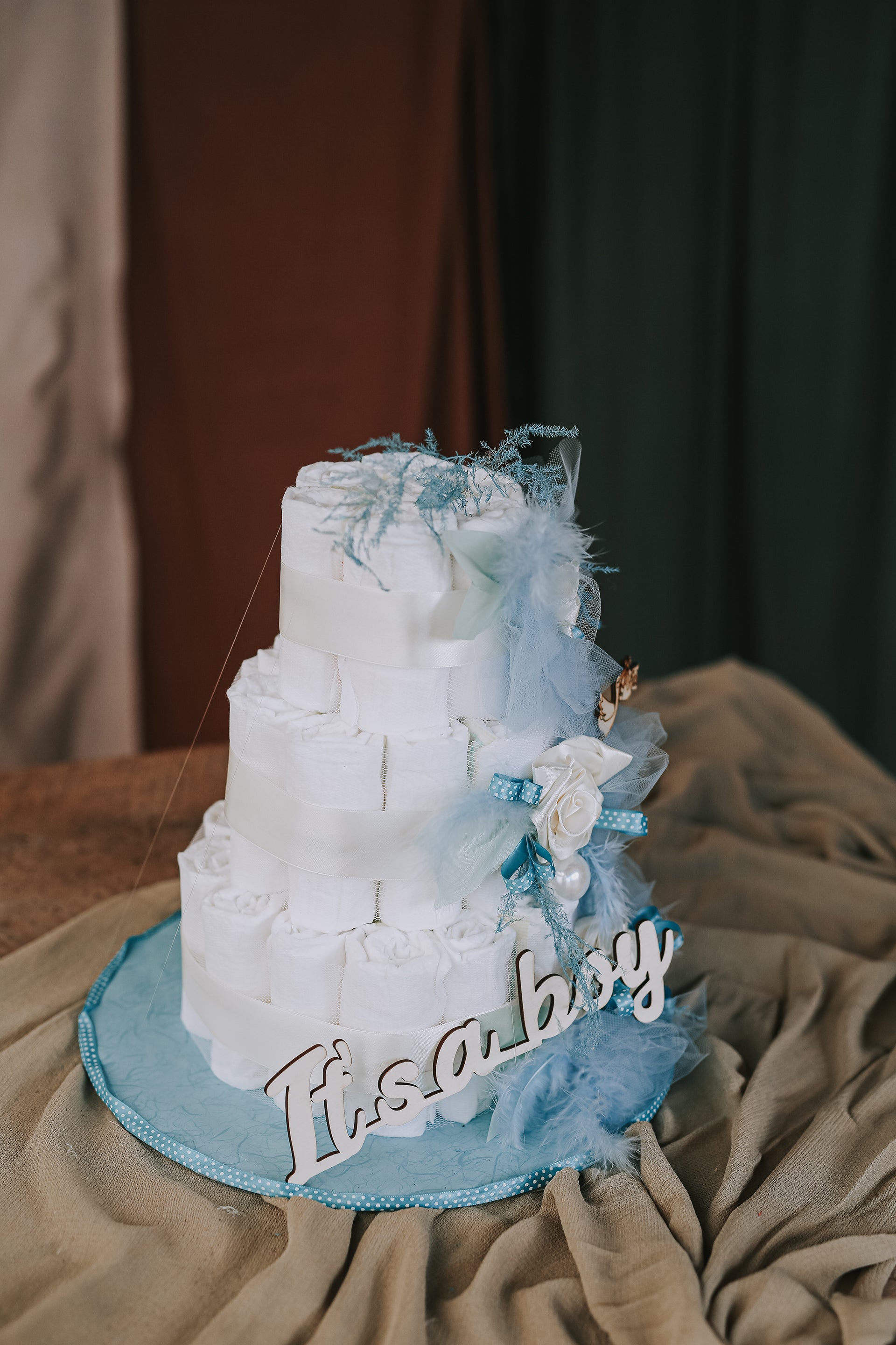 Eine wunderschöne Torte aus zu Rollen gerollten Babywindeln, zusammengesetzt zu einer 3-stöckigen Torte, wunderschön dekoriert mit blau-weißen Deko-Accessoires und Satinbändern und einem Holzschild „It’s aboy“.
