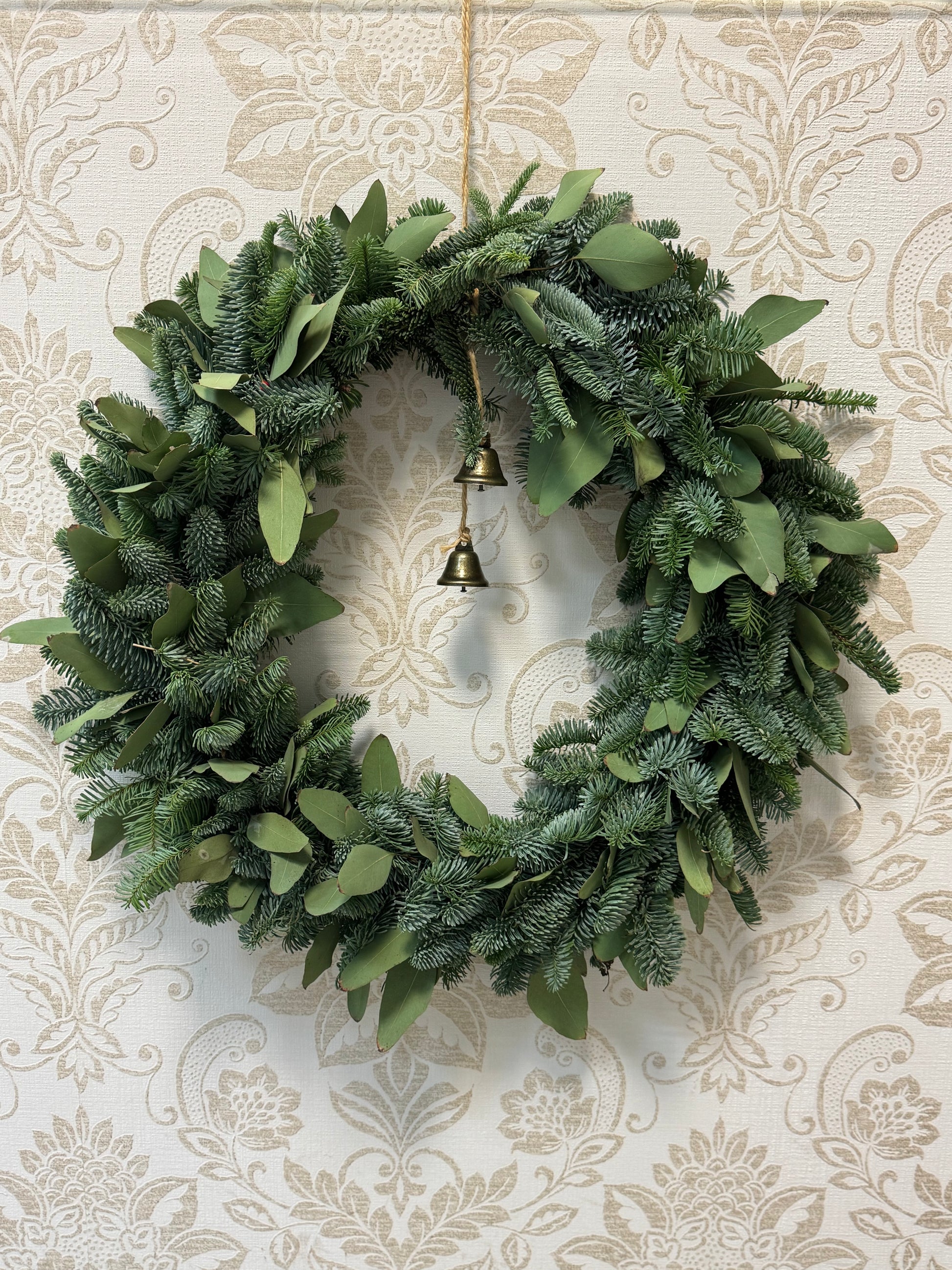 Venček Evergreen je sestavljen iz zelenih vej smreke, eucalypthusa in treh zvončkov, ki skupaj ustvarijo naraven in topel videz.