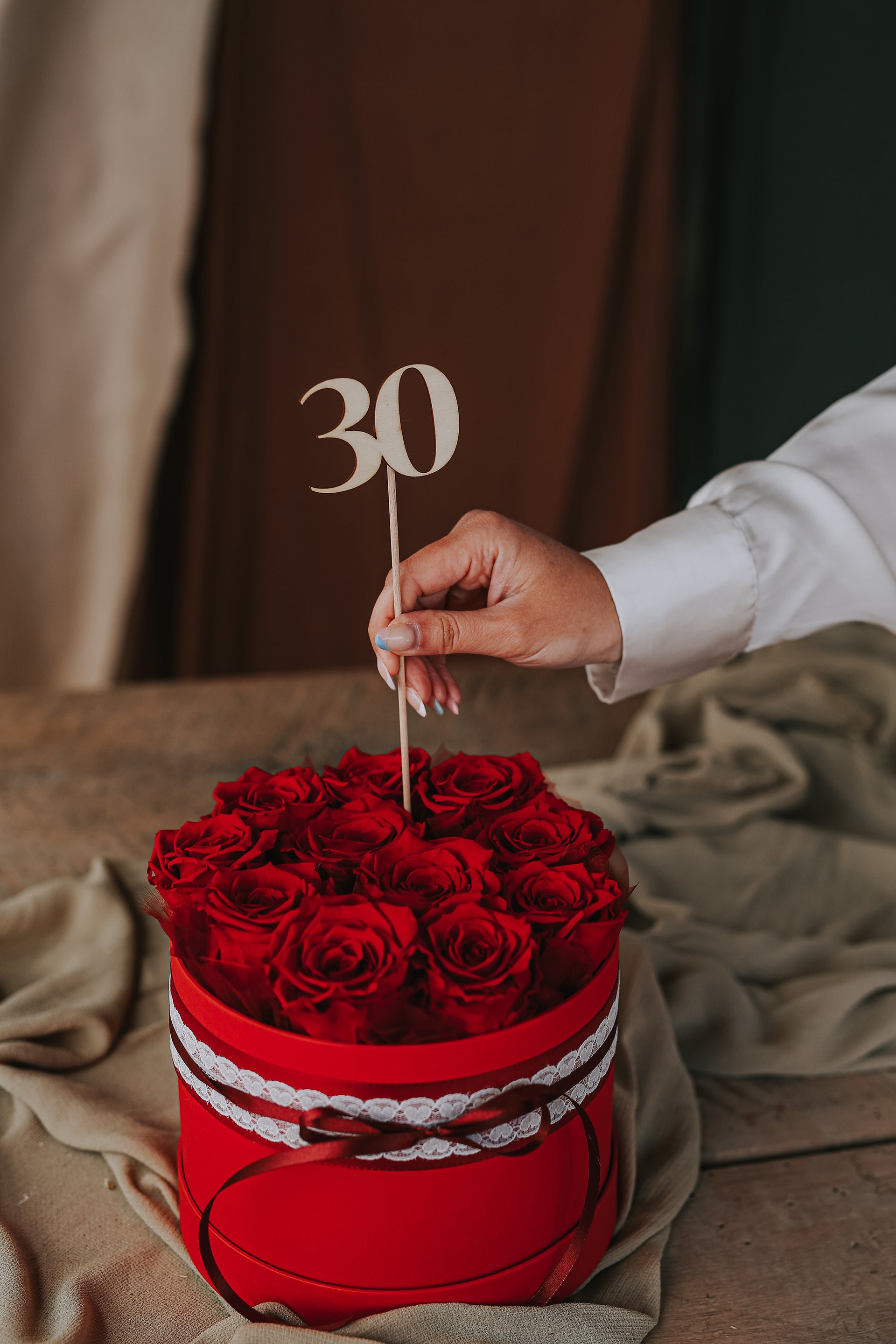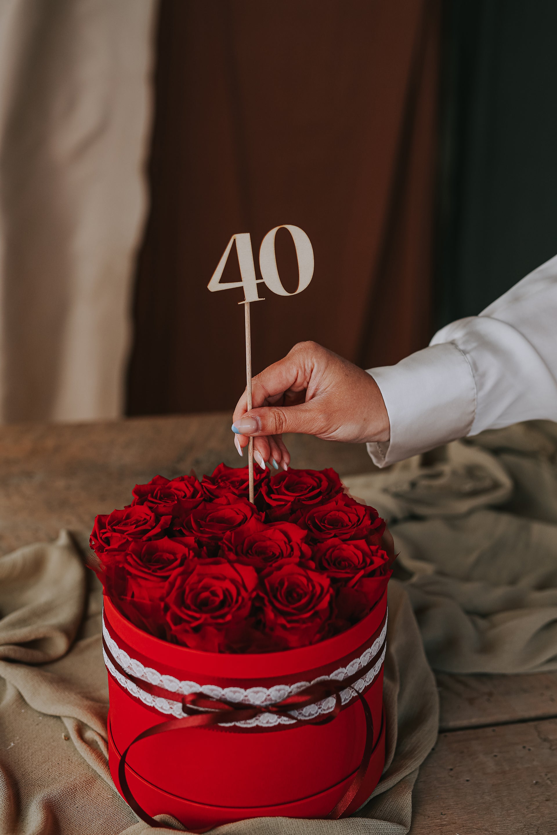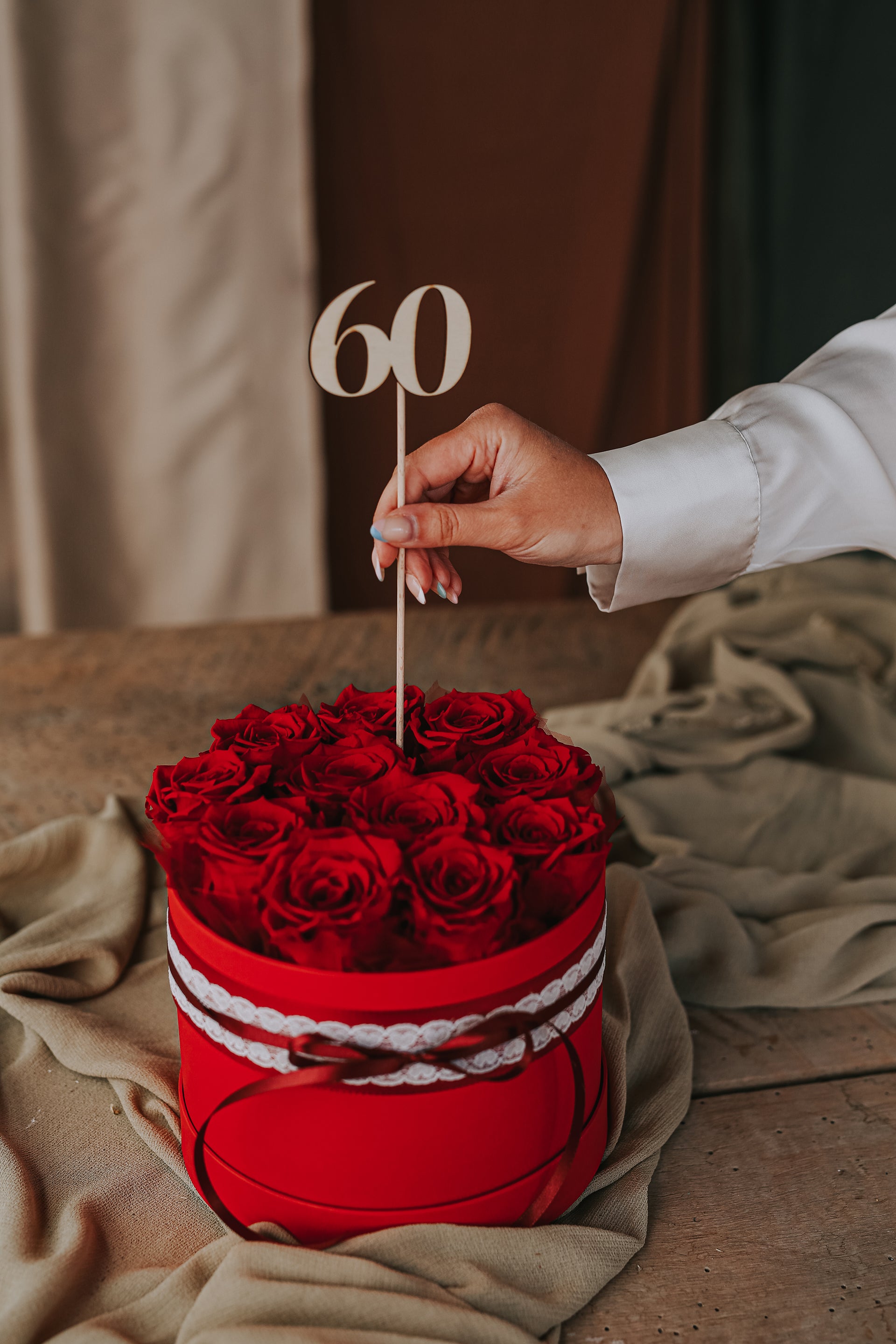 You can choose between three sizes (SMALL box consists of six roses, MEDIUM box consists of eight roses and LARGE box consists of eleven roses) and different colors. Each box is accompanied by the dedication "You are THE BEST!" and a wooden number of your choice (18, 20, 30, 40, 50, 60, 70, 80 and 90). If you want us to add a wooden number to the product, add it next to the dedication.