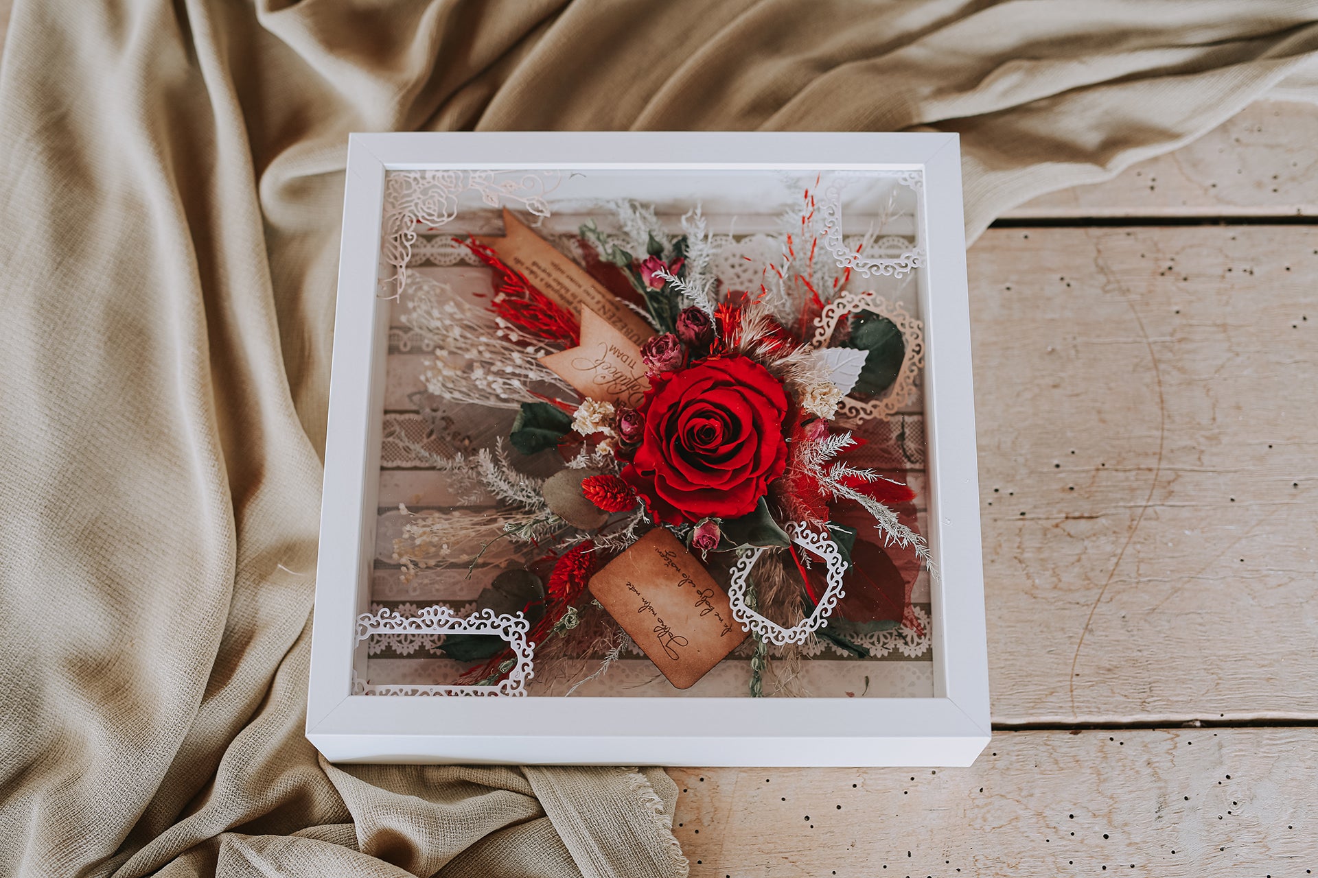 Dry and prepared flowers, arranged in a beautiful whole behind glass in a frame, with an attached message, will surely represent a long-lasting, precious memory. Suitable for a loved one's birthday, anniversary, Valentine's Day or as a declaration of love.