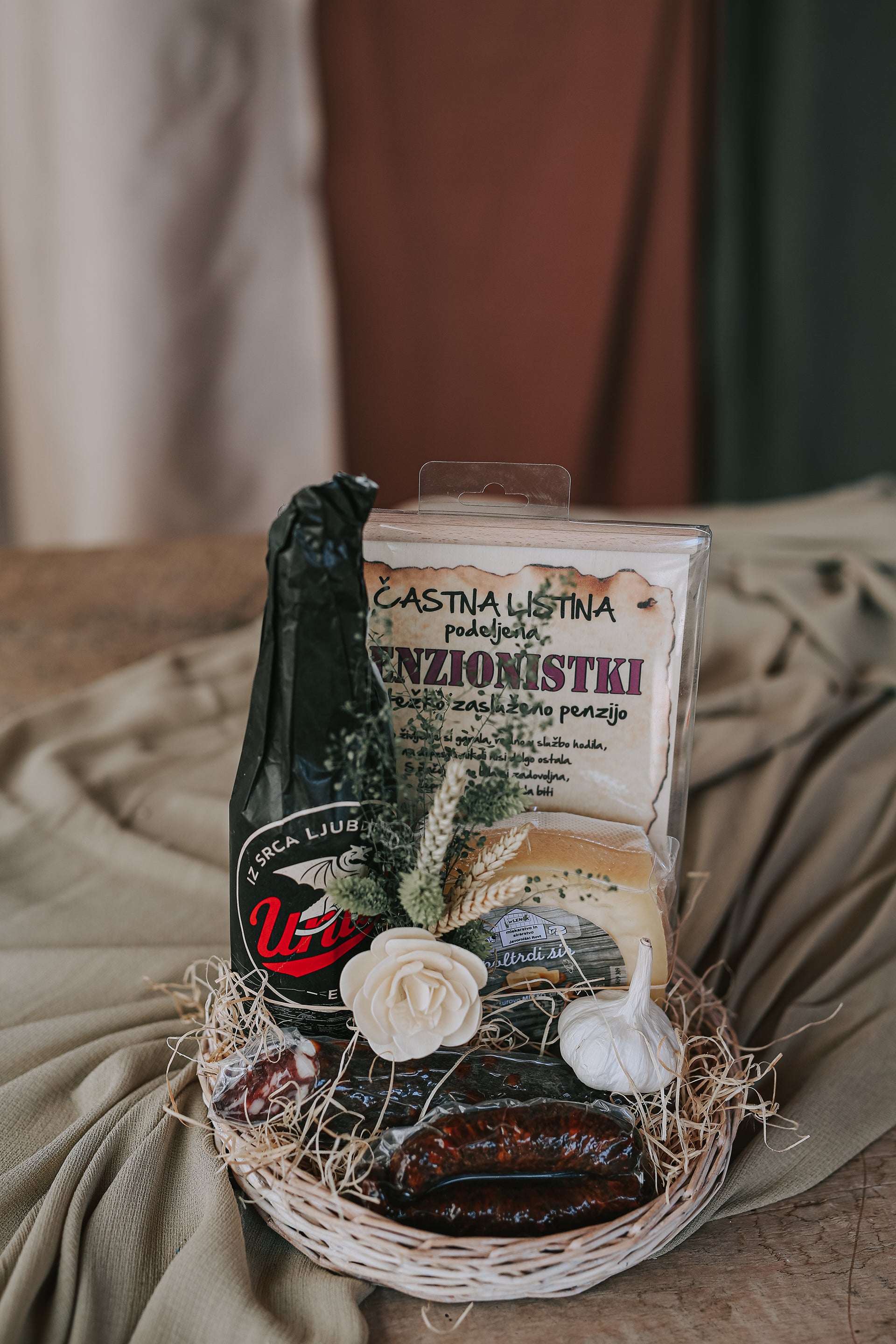 Dark unfiltered beer Union, 4.6% Al., sausage, a piece of dry salami, cheese and garlic, which always goes well with a good snack. Everything is decorated with dried flowers in a bouquet.