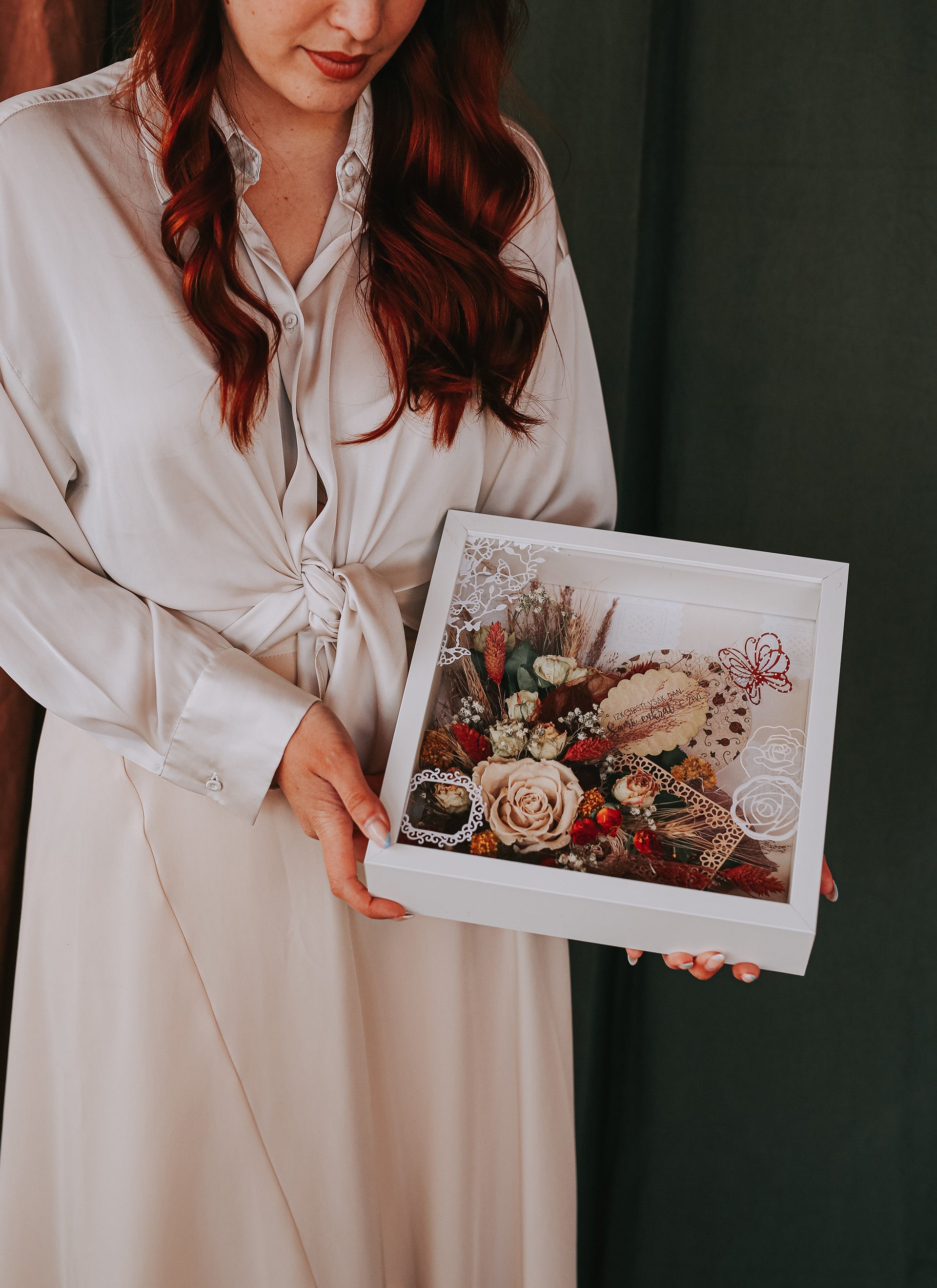 Dry and prepared flowers, arranged in a beautiful whole behind glass in a frame, with an attached message, will surely represent a long-lasting, precious memory. Suitable for a birthday, anniversary, special achievement.