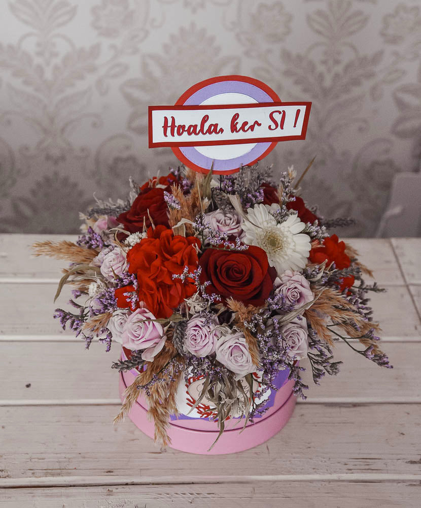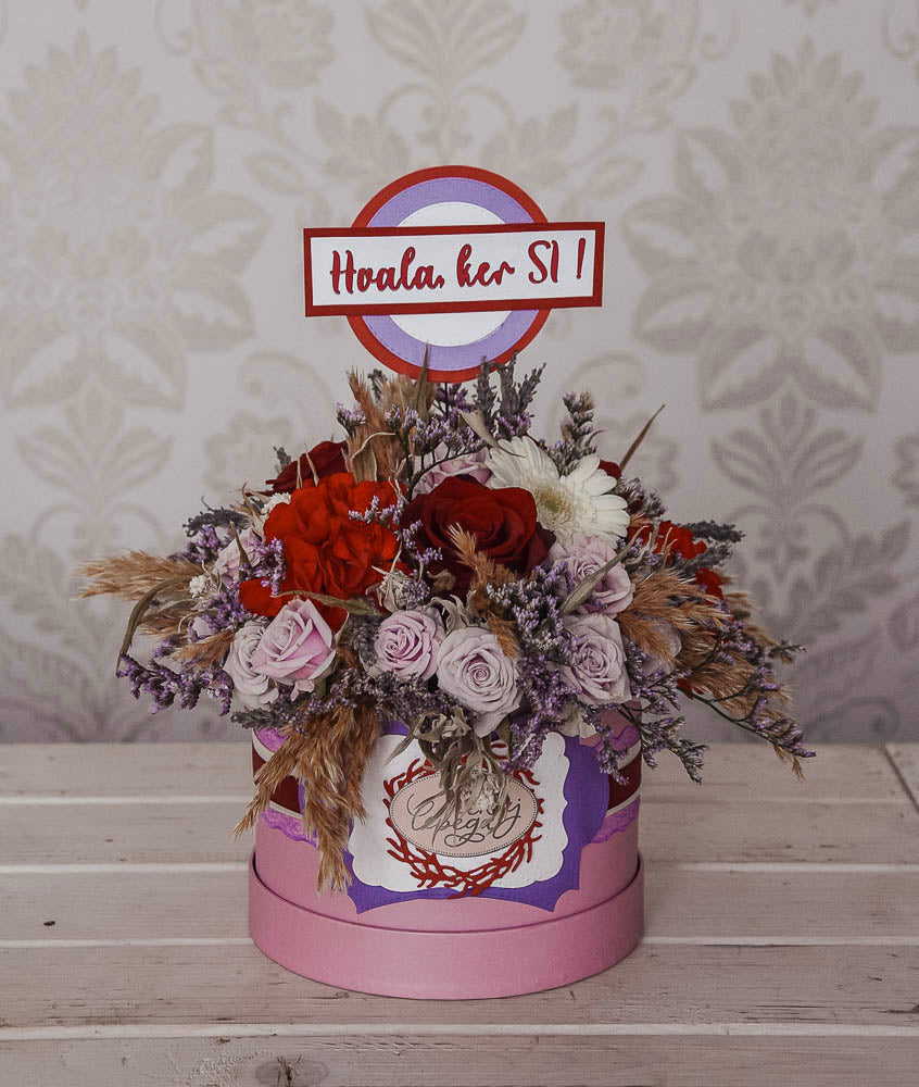 V glamourozni okrogli škatli, je lično oblikovan cvetlični aranžma.