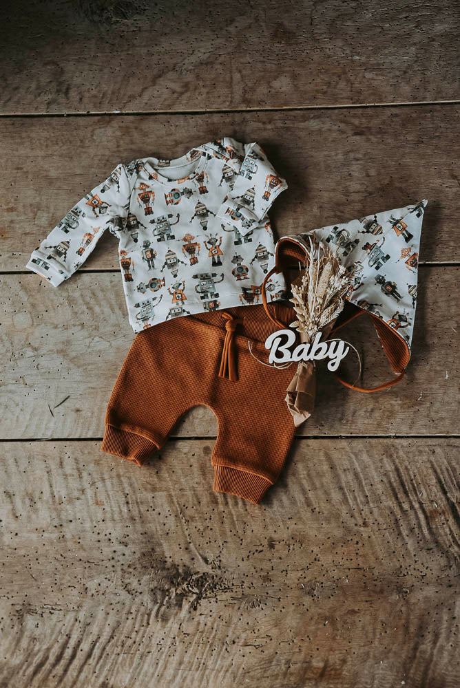 Iz izbranih (otroku prijaznih) materialov je z obilico ljubezni mojstrica sešila kompletek kapice, majčke z dolgimi rokavi in dolgih hlačk, primeren za novorojenčka. Dopolnjuje ga suh šopek in lesen napis baby.
