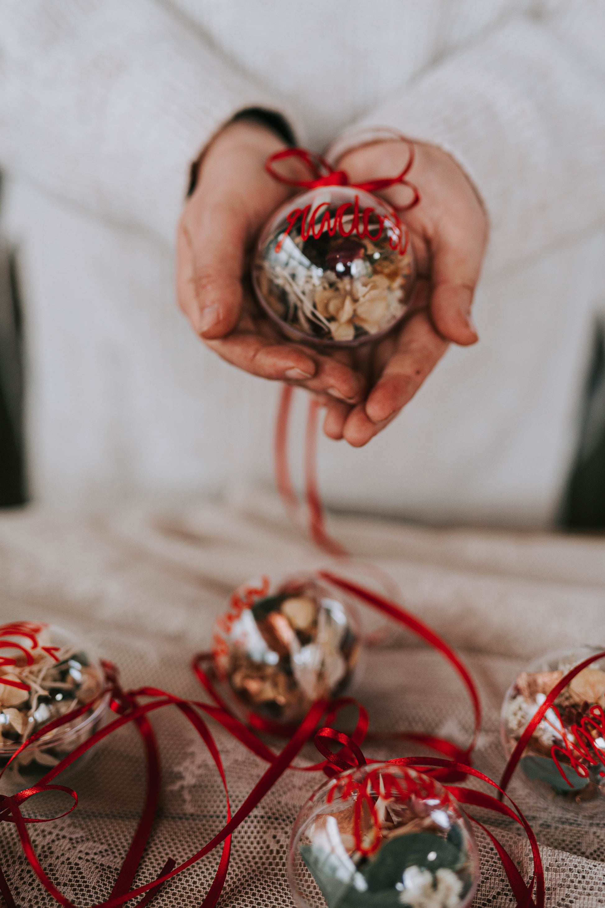 Vsebina krogle je izključno sestavljena iz suhega cvetja, za piko na i pa smo dodali še rdečo mašnico.