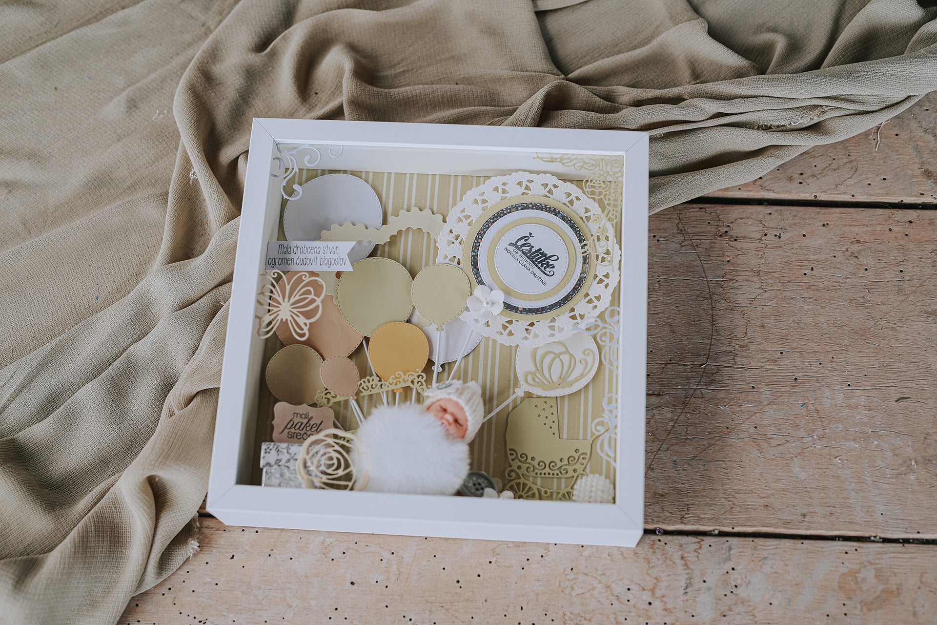 Ob rojstvu novorojenčka je okvirček s prikupno vsebino idealno darilo, ki bo trajen spomin tako staršem kot kasneje otroku. V okvirju se nahaja figurica novorojenčka, ki je olepšana z raznimi dekorativnimi dodatki v beli, bež in rumeni barvi, z balončki za srečo ter priloženimi citati. Če želite se lahko okvirček tudi personalizira. Doda se ime in priimek novorojenčka, teža, velikost, datum ter ura rojstva.
