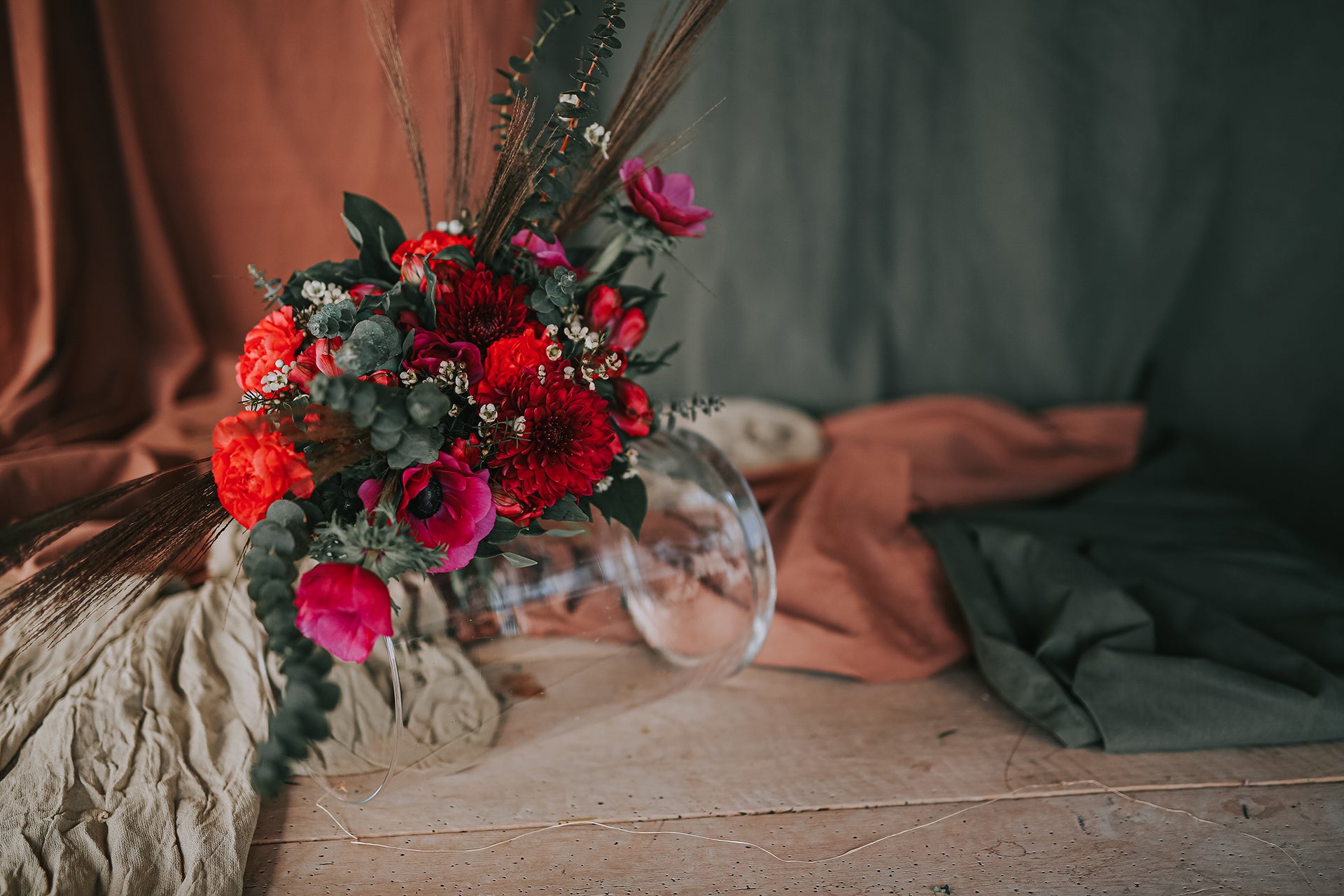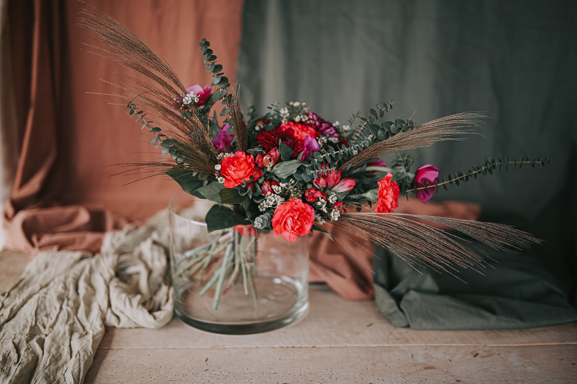 Kraljeva kombinacija bordo rdečih odtenkov, ciklam anemon, rdečih nageljčkov in prav takšnih alstromerij v objemu bujnega evkaliptusa, waxa, zelenja in suhe trave. Za vse, ki so radi drugačni in si želijo pestrosti v slehernem dnevu.