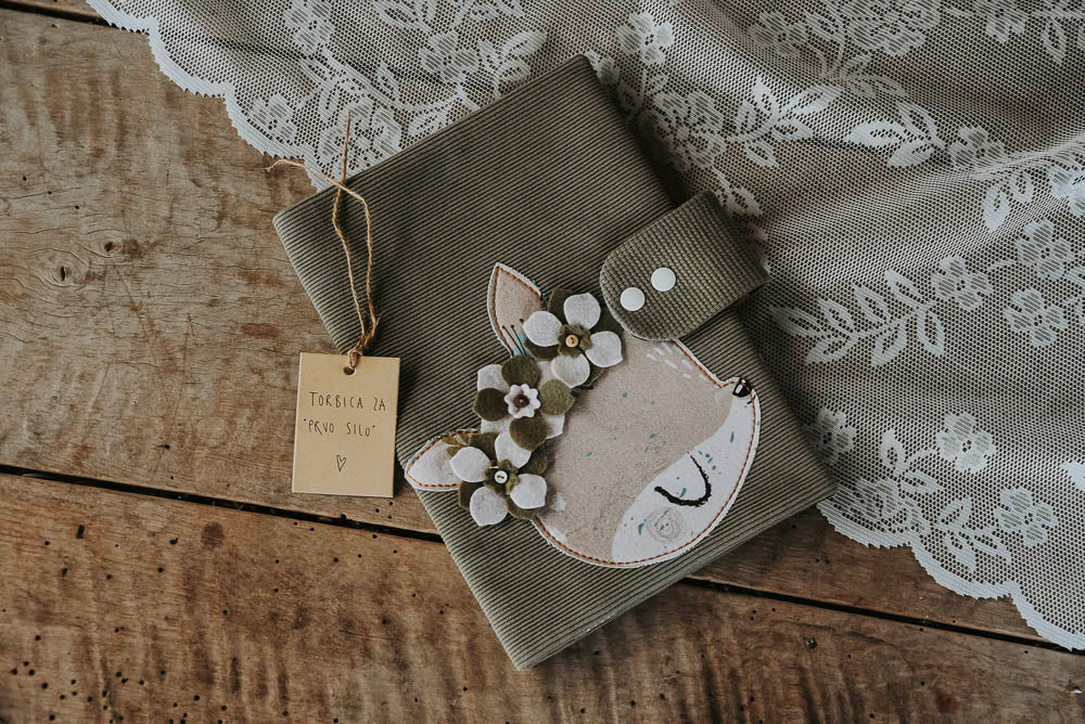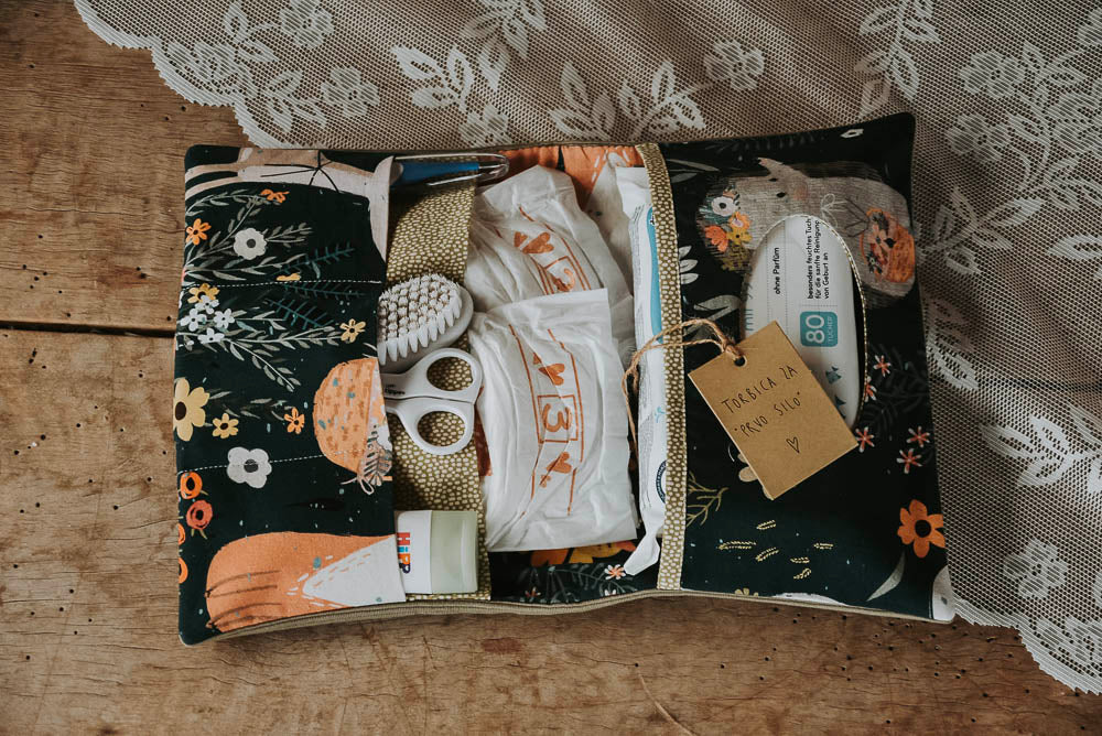 Iz izbranih (otroku prijaznih) materialov je z obilico ljubezni mojstrica sešila torbico, ki je primerna za novorojeno deklico. Vsaka mamica potrebuje na poti pleničke, robčke in kremico, ki jih spravi v to čudovito torbico za prvo pomoč.