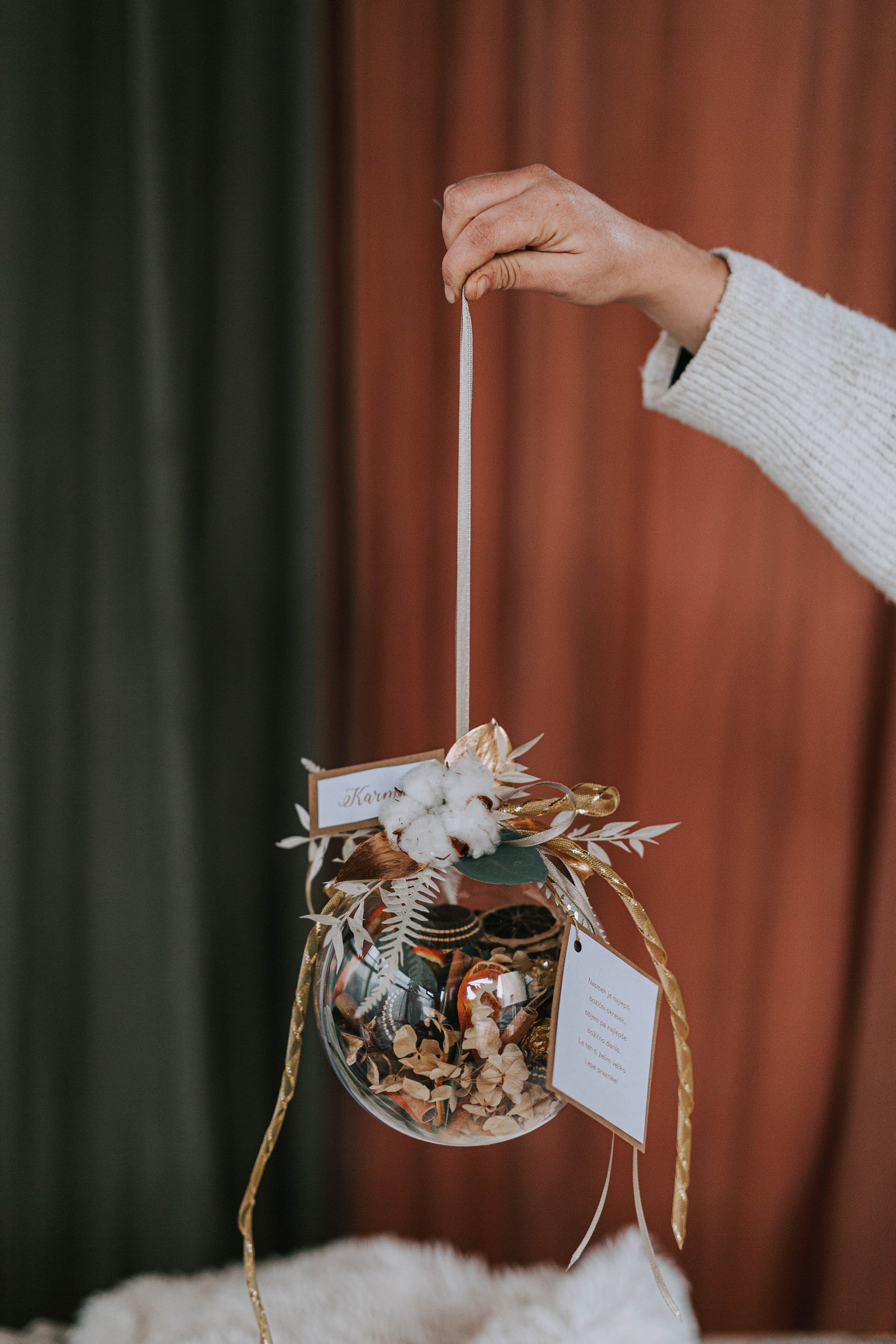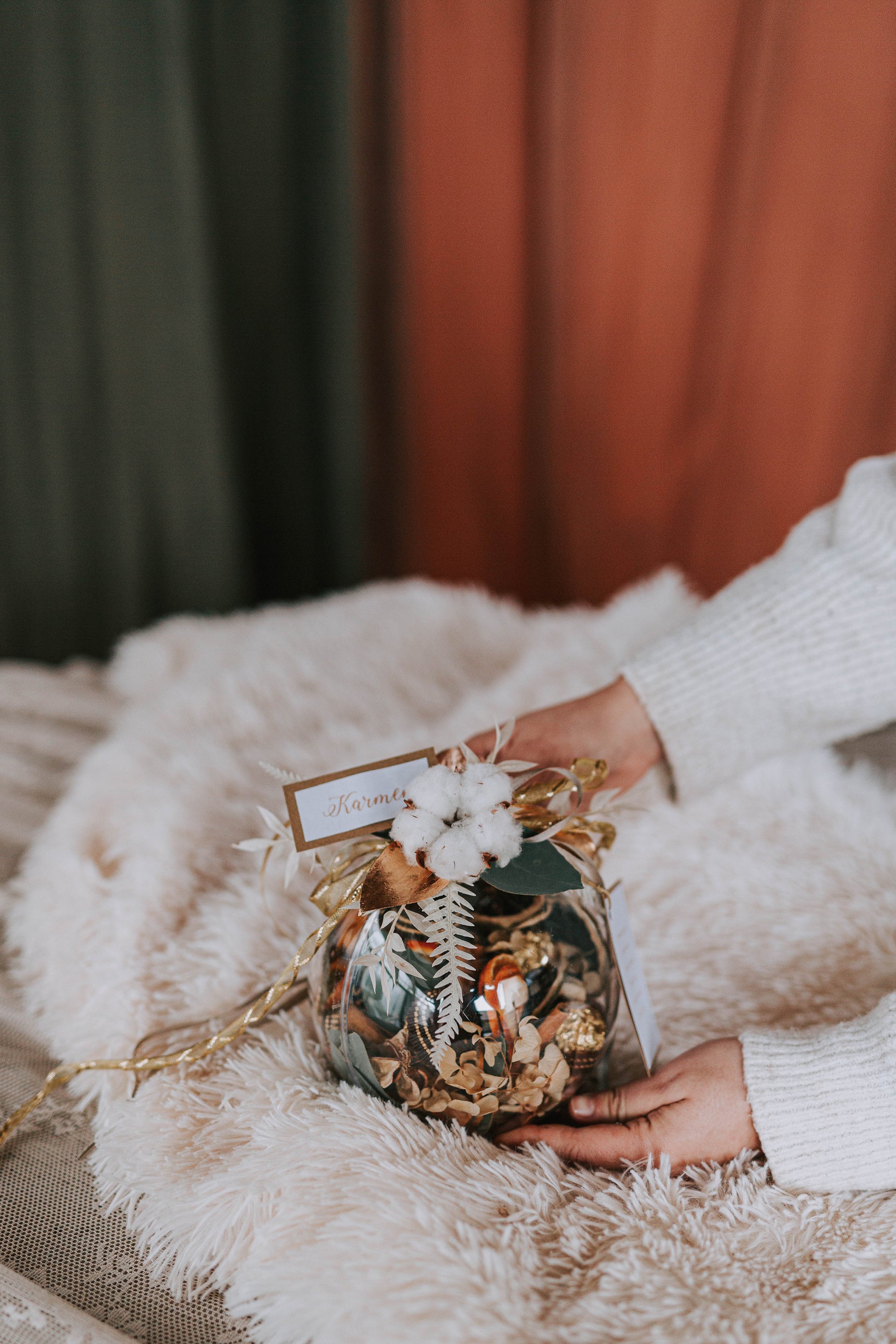 Vsebina krogle je sestavljena iz ferrero rocher bonbonov, suhim sadjem in suhim cvetjem. Prav tako se doda ime obdarovanca in posvetilo, ki ju napišete pod personaliziranim sporočilom v košarici.